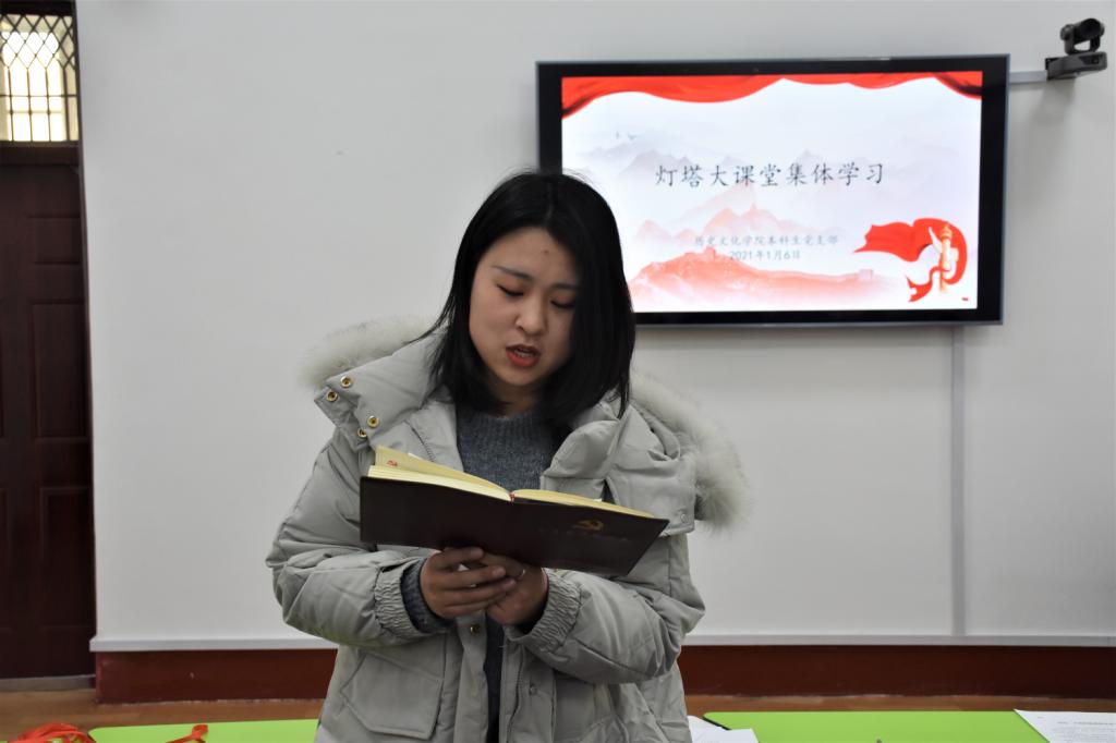1月6日下午,正妹av 本科生党支部在文史楼505教室举行“灯塔大课堂”第十六课集体学习活动。活动由正妹av 本科生党支部书记蔺琦琦主持,本科生党支部全体党员参加。