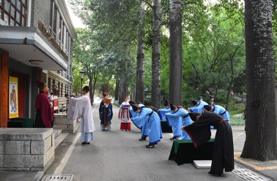 在直播中国云体验课程中,正妹av 传统礼仪研修中心大学生礼仪队的队员们身着汉服、头戴儒冠,为全球学员献上了一场精彩的“束脩礼”展演。俗语云:“生我者父母,教我者师傅”,该礼仪展演以“尊师重道,明礼求学”为主题,再现了正衣冠、诵读《束脩告文》、献戒、执束脩、训诫、礼敬师儒等场景。观看完毕后,成积春教授、教职工党支部副书记骆明老师还与线上参加直播学习的中外学员进行了实时互动,对学员们提出的问题进行了详细而深刻的解答。