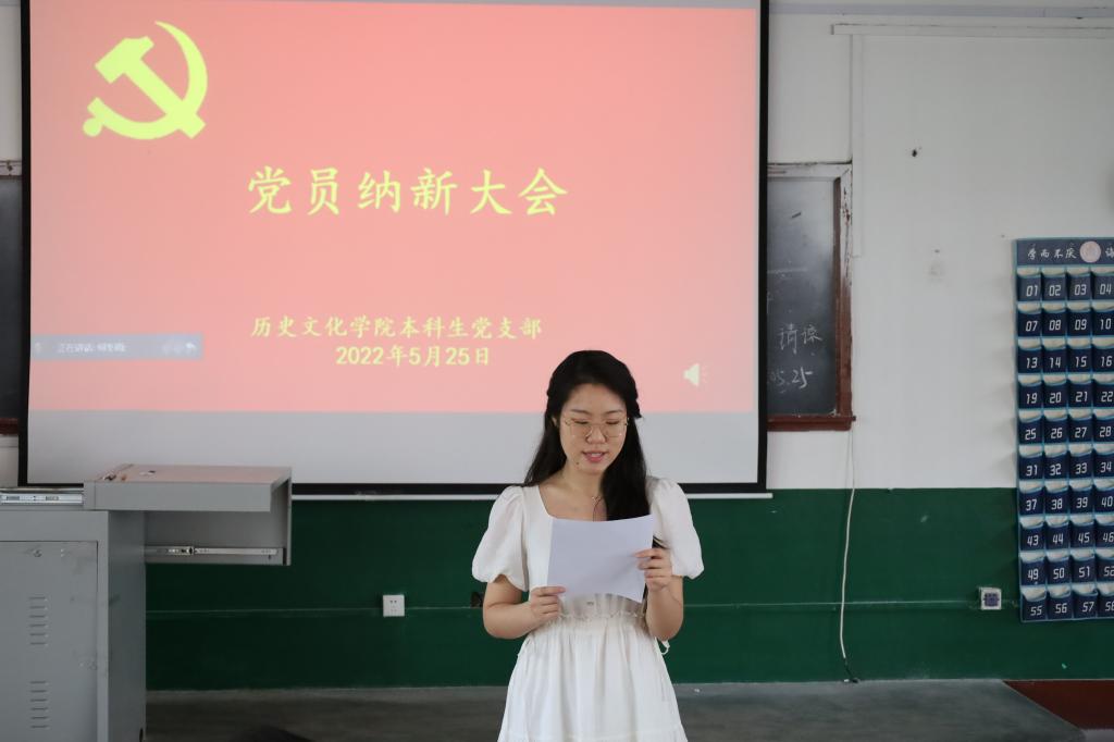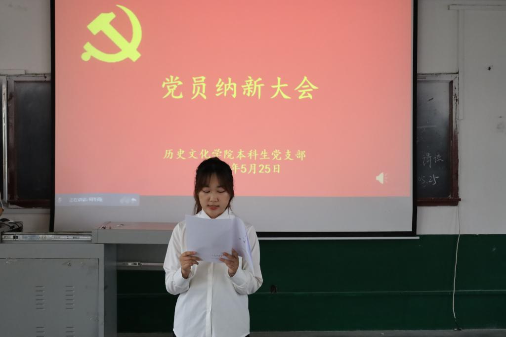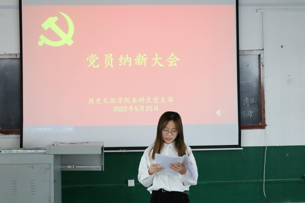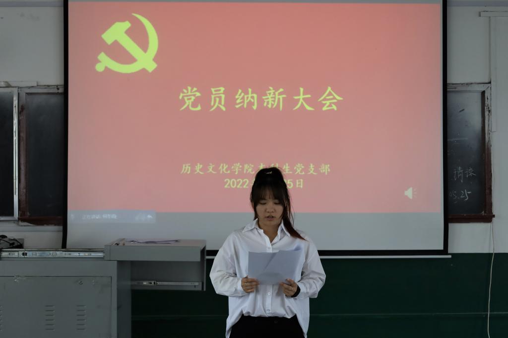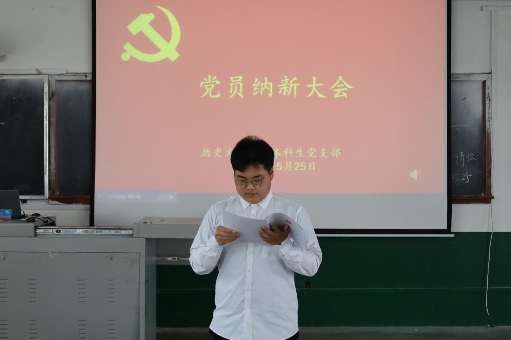 会议开始由本科生党支部副书记蔺琦琦同志介绍了张雨童、周钰等30名同志的基本情况,报告与会人数,介绍会议流程,并宣布纳新大会开始。