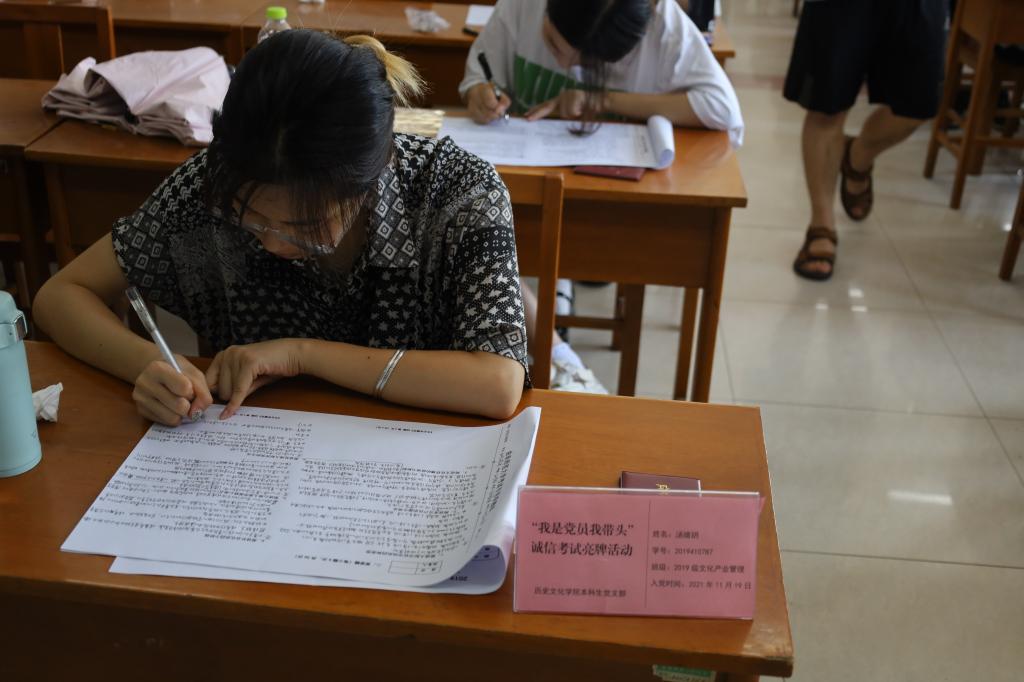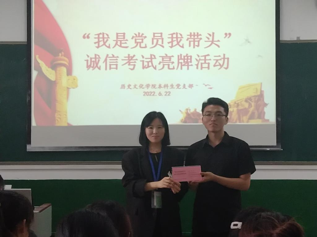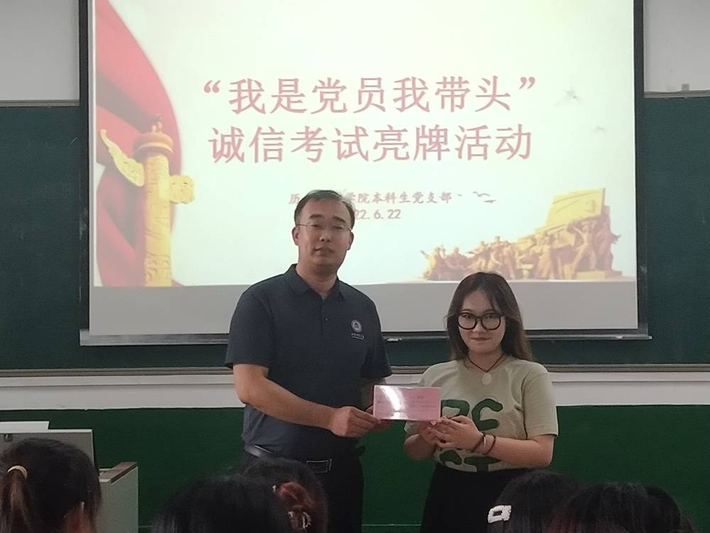 正妹av 党委副书记、本科生党支部书记王建阳,本科生党支部组织委员刘贤贤,本科生党支部宣传委员董经给各位党员颁发诚信考试姓名牌,并要求各位党员在考试中树立先锋模范作用,遵守考试纪律,严守考风考纪,诚信考试。