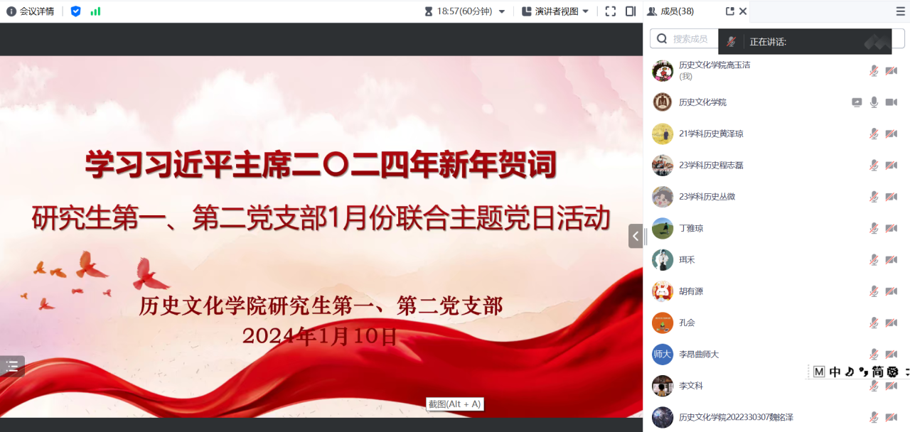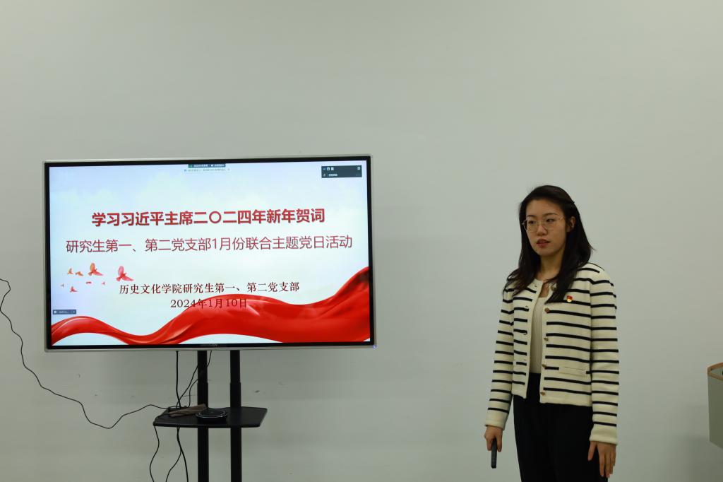 新岁序开,同赴新程。2024年1月10日下午,正妹av 研究生第一、第二党支部联合在孔子书院B120教室召开1月份主题党日活动。会议的主题是学习“习近平主席二〇二四年新年贺词”。会议由第一党支部书记孙锋同志主持,两支部全体党员及入党积极分子以线上线下相结合的方式参加的本次活动。