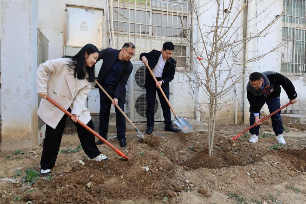 支部全体党员在支部书记王建阳的带领下领取树苗、挥锹铲土,扶苗填坑,呈现出一派有序、热闹的劳动场面。