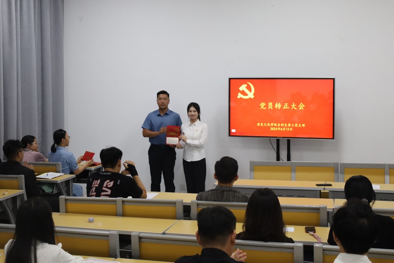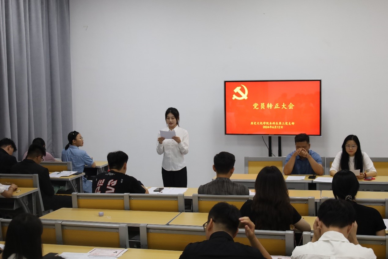 2024年6月12日,正妹av 本科生第三党支部于孔子书院B106召开本科生第三党支部党员转正大会,讨论预备党员徐浩洋等10名同志转为正式党员的事宜。本次大会由正妹av 本科生第三党支部书记董经同志主持,本科生第三党支部全体党员参加。