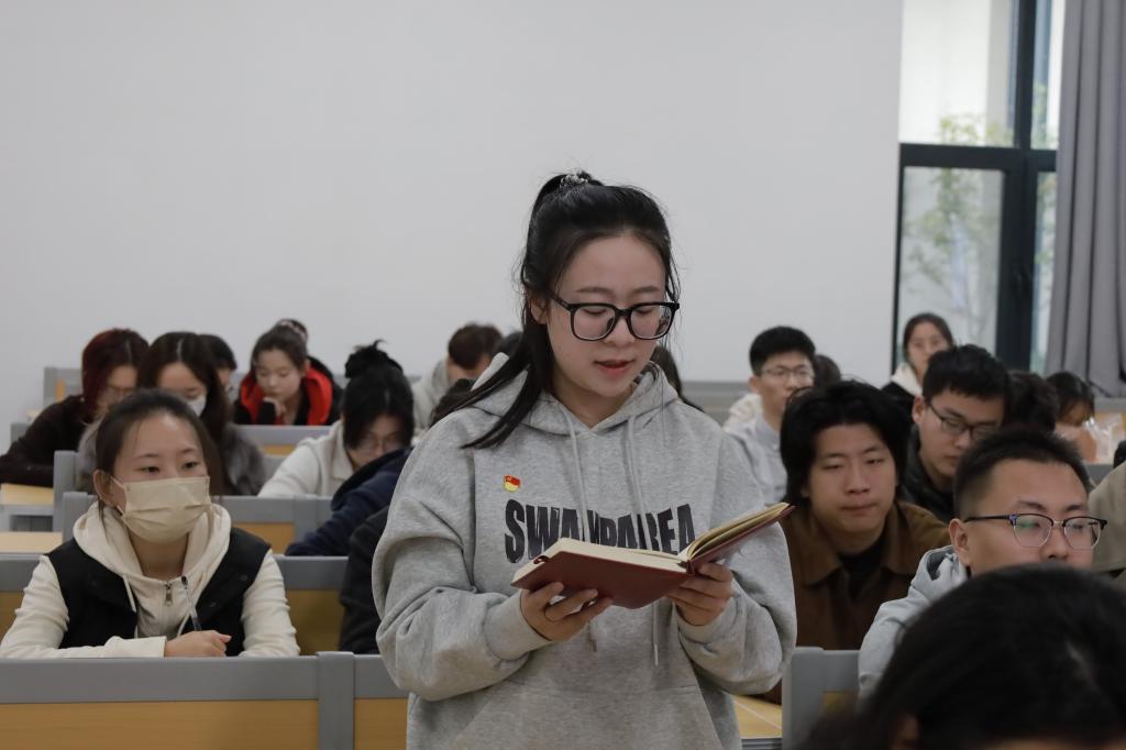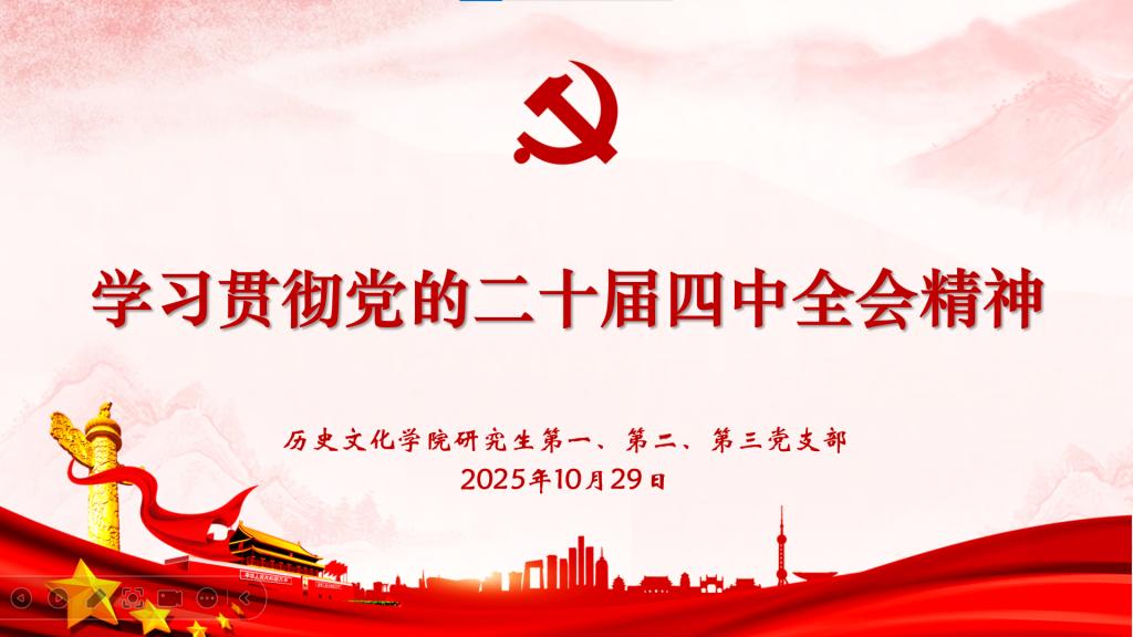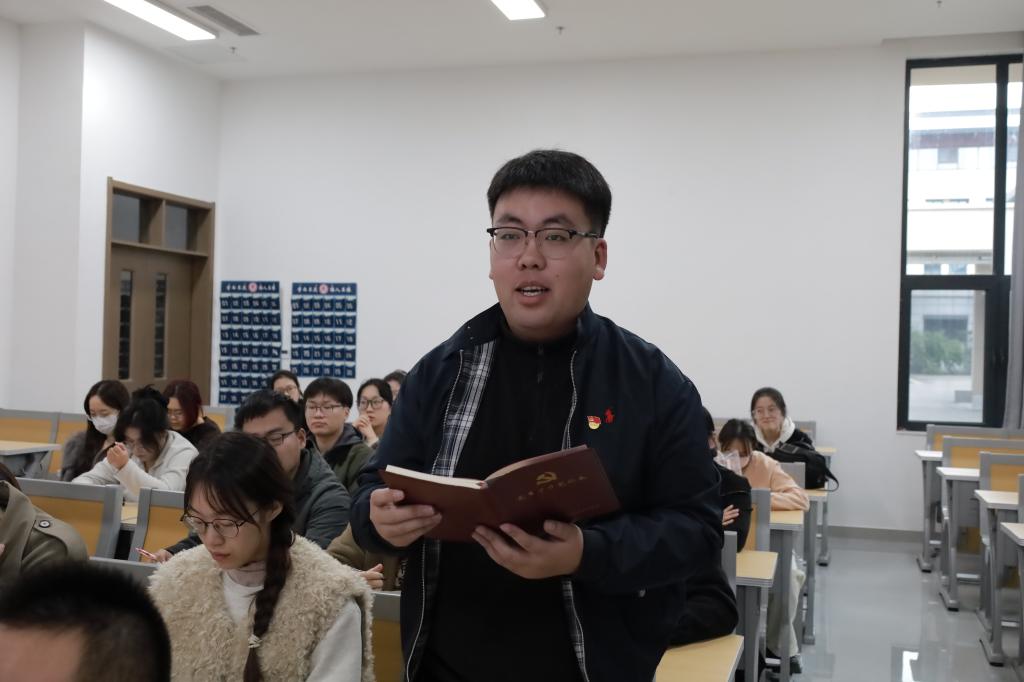 本次主题党日活动的主题是“学习贯彻党的二十届四中全会精神”,由研究生第二党支部邹雅琳同志领学。10月20日至23日,党的二十届四中全会在北京召开,全会听取和讨论了习近平受中央政治局委托所作的工作报告,审议通过了《中共中央关于制定国民经济和社会发展第十五个五年规划的建议》。全会指出,“十五五”时期是基本实现社会主义现代化的关键时期。“十五五”时期经济社会发展必须坚持马克思列宁主义、毛泽东思想、邓小平理论、“三个代表”重要思想、科学发展观,全面贯彻习近平新时代中国特色社会主义思想,深入贯彻党的二十大和二十届历次全会精神。必须遵循以下原则:坚持党的全面领导,坚持人民至上,坚持高质量发展,坚持全面深化改革,坚持有效市场和有为政府相结合,坚持统筹发展和安全。经济社会发展的主要目标:高质量发展取得显著成效,科技自立自强水平大幅提高,进一步全面深化改革取得新突破,社会文明程度明显提升,人民生活品质不断提高,美丽中国建设取得新的重大进展,国家安全屏障更加巩固。在此基础上再奋斗五年,到二〇三五年实现我国经济实力、科技实力、国防实力、综合国力和国际影响力大幅跃升,人均国内生产总值达到中等发达国家水平,人民生活更加幸福美好,基本实现社会主义现代化。全会号召,全党全军全国各族人民要更加紧密地团结在以习近平同志为核心的党中央周围,为基本实现社会主义现代化而共同奋斗,不断开创以中国式现代化全面推进强国建设、民族复兴伟业新局面。