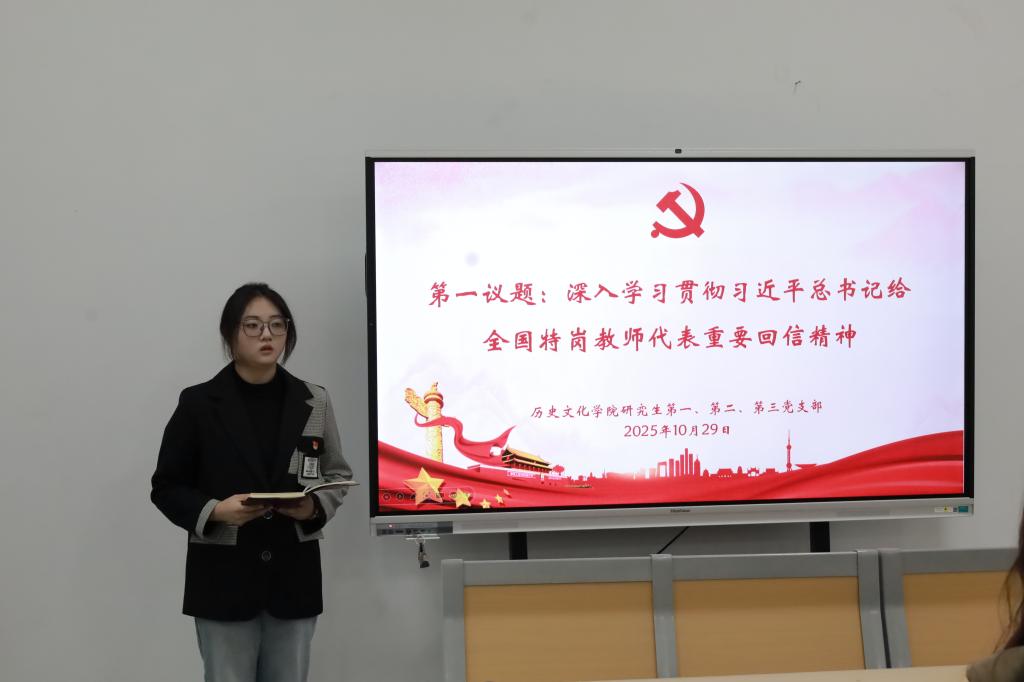 会上,研究生第二党支部魏明宇、第三党支部李美琪结合自己的学习工作,分别就学习贯彻党的二十届四中全会精神和习近平总书记给全国特岗教师代表重要回信精神谈了自己的体会。孙锋对本次活动进行了总结,希望全体党员同志持续深入学习贯彻党的二十届四中全会精神和习近平总书记给全国特岗教师代表重要回信精神,在推进强国建设、民族复兴伟业中展现青春作为、彰显青春风采、贡献青年力量。