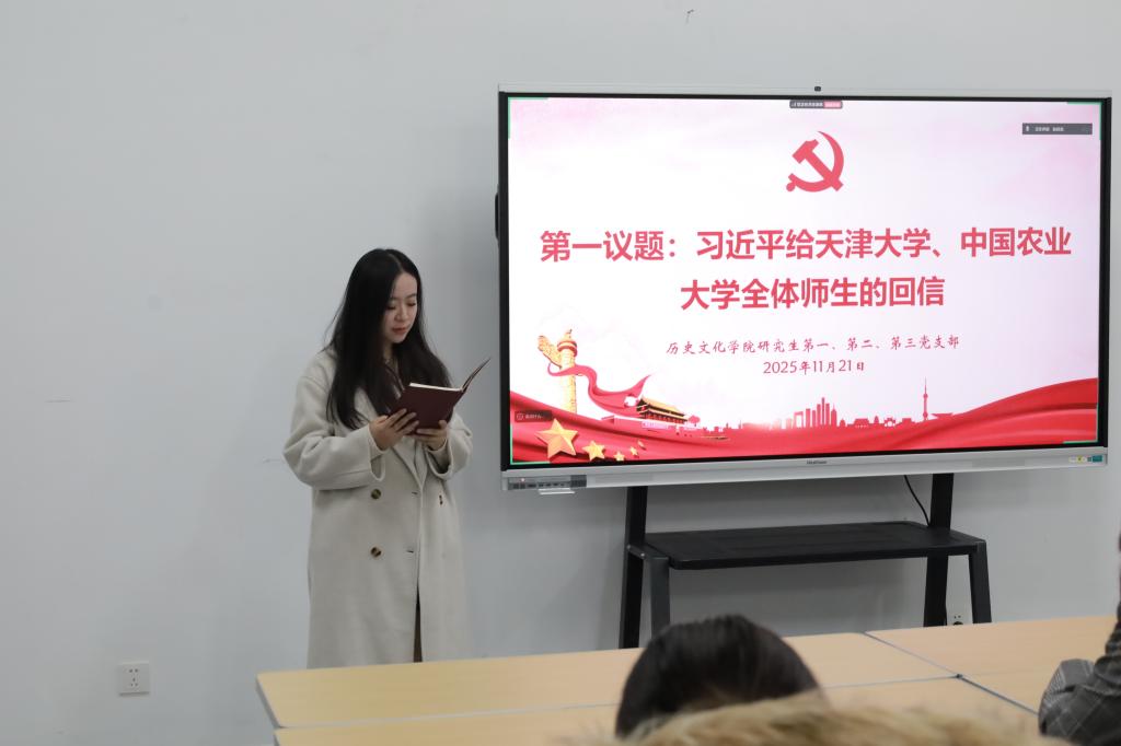 主题党日活动前,全体与会党员“第一议题”学习传达了“习近平总书记给天津大学、中国农业大学全体师生的回信”。习近平总书记在回信中指出:“新起点上,希望你们坚持以新时代中国特色社会主义思想为指导,聚焦国家重大战略需求,深化教学科研改革,加强基础研究和科技攻关,提高人才培养质量,更好服务经济社会发展,为建设教育强国科技强国、推进中国式现代化作出新的贡献。”“新征程上,希望你们弘扬优良办学传统,矢志强农报国,深化教育教学改革,加强农业科技创新和成果转化应用,努力培养更多知农爱农的专业人才,为建设农业强国、推进中国式现代化作出新的贡献。”