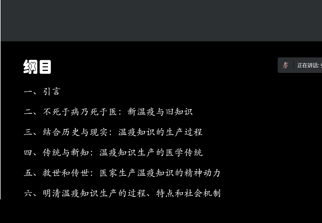 报告第六部分,张老师对本次讲座的主要内容进行了系统的梳理与总结。首先是温疫知识的生产过程,一是观察现实,二是寻找历史经验,三是与前人在对话中提出新说。并且在这一过程中,张老师还总结了温疫知识生产过程中出现的文化,包括医学传统中的文化与社会文化。其次,张老师结合自身研究内容总结了明清温疫知识生产过程中的特点:一是民间化,二是市场化,三是个人化。最后,张老师对温疫的社会应对机制进行了梳理,其应对流程为:温疫发生—人口死亡—医家的个人应对(发明知识)—不同学说自由竞争—优胜劣汰—新知识形成。