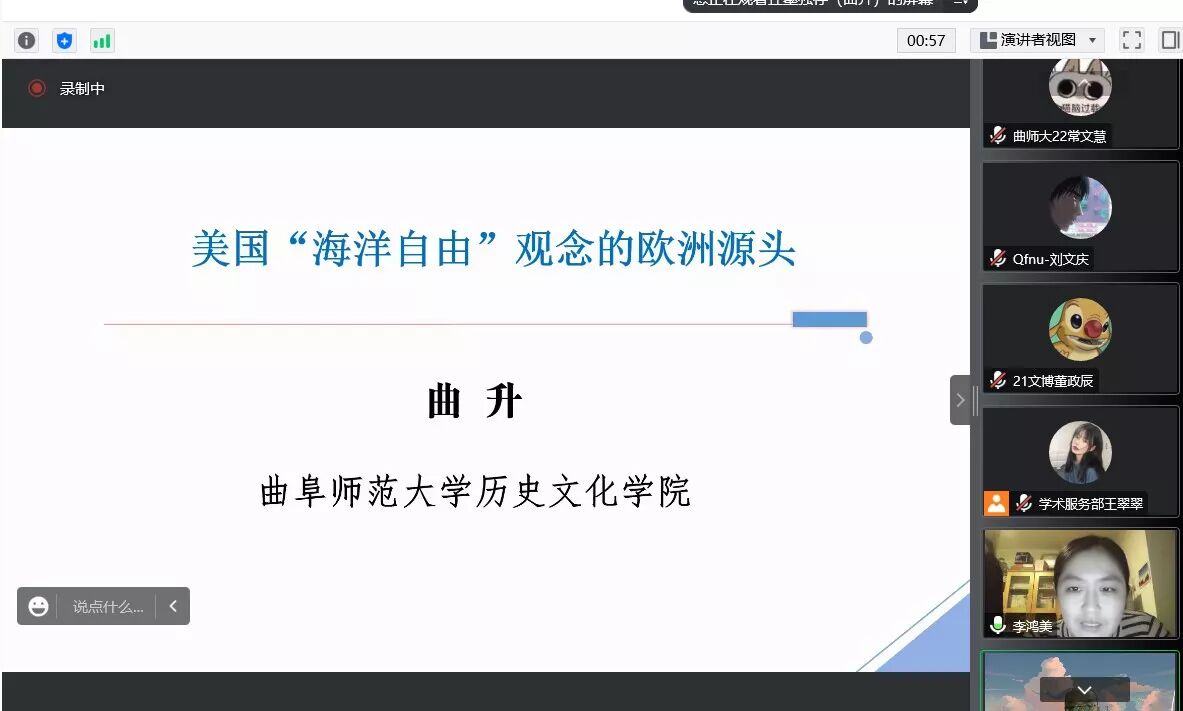 2022年11月24日晚,正妹av 教授曲升做客“洙泗讲堂”,通过腾讯会议做了题为《美国“海洋自由”观念的欧洲源头》的学术讲座。讲座由李鸿美副教授担任主持人,我校张赫名副教授担任与谈人,相关专业师生及线上听众220余人参加此次活动。