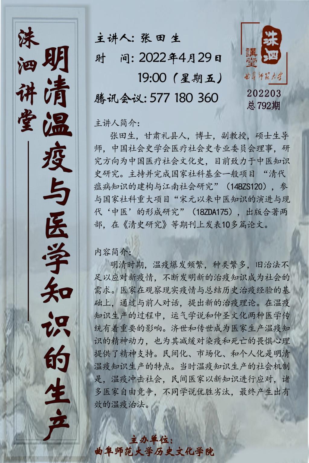 洙泗讲堂预告|张田生:明清温疫与医学知识的生产