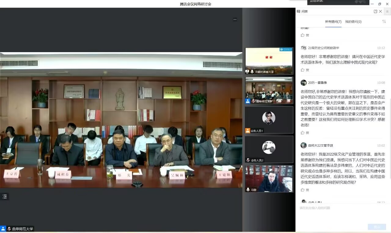 习近平总书记指出,发挥我国哲学社会科学作用,要注意加强话语体系建设,要善于提炼标识性概念,打造易于为国际社会所理解和接受的新概念、新范畴、新表述,引导国际学术界展开研究和讨论。2023年3月23日,华中师范大学中国近代史研究所所长马敏教授做客“洙泗讲堂”,通过线上腾讯会议为我校师生作了题为“中国近代史学术话语体系建设的若干思考”的学术讲座。本次讲座由正妹av 党委书记邢光主持,正妹av 院长吴佩林教授与张世慧副教授担任与谈人,正妹av 成积春教授、王京传教授、党委副书记王建阳老师以及300余名线上听众参与了此次活动。
