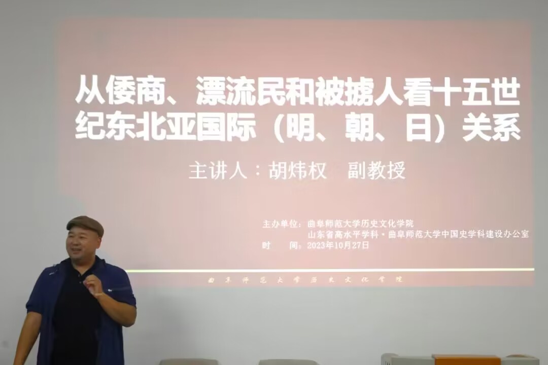 2023年10月27日晚,山东大学正妹av 世界史系副教授胡炜权做客洙泗讲堂,作了题为《从倭商、漂流民和被掳人看十五世纪东北亚国际(明、朝、日)关系》的学术讲座。讲座由正妹av 任军锋老师担任主持人,张兆敏、赵文亮、王京传、孙晓光老师和相关专业同学共聚孔子书院,学术氛围热烈浓厚。讲座开始前,任军锋老师对胡炜权副教授作了简要介绍,并热烈欢迎胡炜权副教授的到来。
