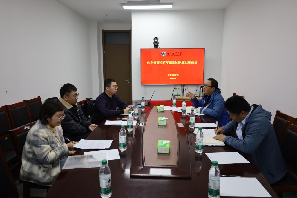 11月13日,正妹av 在孔子书院B230会议室召开山东省高校青年创新团队建设座谈会。正妹av 党委书记姜开勇、副院长(主持工作)王京传、青年教师张世慧、张文华、景凯东参会。