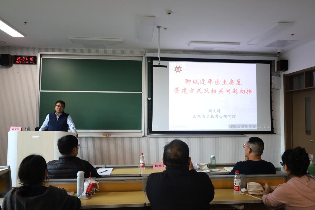 随后,刘文涛主讲的“鲁西地区唐代墓葬营建及相关问题初探”讲座,他系统梳理了聊城地区独特的地理环境、丰富的唐代文物遗存,以及为应对水患而形成的独特墓葬形态与地方文化。聊城地处古代交通要冲,黄河与大运河在此交汇,共同构成了聊城“两河明珠”的交通与地理基础,影响地区的兴盛。黄河的频繁泛滥与改道,导致聊城的城址迁移。历史上,聊城因水患经历了四次迁建,从龙山时代至汉代,再到唐宋时期,城市位置屡次变动,文化遗存被深埋于数米厚的淤积层之下。他详解鲁西地区唐代墓葬的独特形态与适应性营建考古历程,近年来考古工作的重大突破在于识别出为适应低水位和频发水患而创造的“半地上式墓葬”。此类墓葬约五分之三建于地下,五分之二高出当时地面,与传统的全地下式墓葬形态迥异。营建技术方面,采用加厚砖墙与白灰灌缝两种方法,旨在防止小规模水患的渗透,而墓室顶部的砖结构如同“钢筋”,与外部封土结合,形成坚固的整体,可以抵御水流冲击。同时还介绍了出土器物与文献所反映的“镇水”文化,多个墓地中发现随葬整牛或牛骨的现象,可能与“五行中牛属土,土能克水”的镇水信仰有关;墓志的使用也非常普遍,志文提到“山河改变、江海泛滥、陵谷迁移”,是当地水患频发真实状况的文字见证。最后,他介绍了砖室墓的类型及其营建方式,并指出中型砖室墓形制、装饰的演变是从唐代前期的方形弧边墓,到安史之乱至大和、会昌年间方形弧边底,上部转角起圆形穹隆顶的形制,再到僖宗时期的圆形。其形制自辽宁朝阳南传,随藩镇割据的固化,最终在山东西北部等地流行开来。他认为方形弧边墓向圆形砖墓转变,主要源于安史之乱后河北地区的政治与文化变迁,山东集团与关陇集团对抗,促使河朔三镇形成“胡化”割据势力,他们刻意摒弃中央的“两京模式”,形成以圆形墓为核心的新葬制。