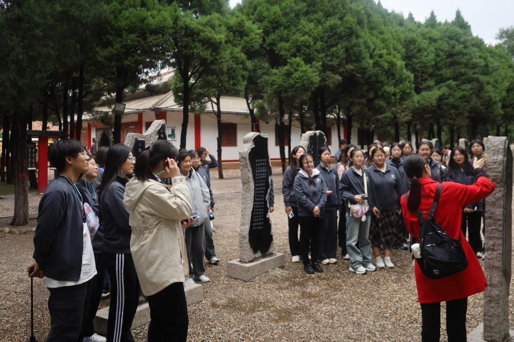 本次研学活动,师生们在研学导师的带领下,依次参观了甲骨文碑林中的石碑。石碑上的甲骨文和背面的释文吸引了大家的目光。学生们通过识别象形文字连成具体语句,对比甲骨文和现代汉字,解读了中国最早的“天气预报”,深切感受到了古人的智慧和中国文字文化的精妙之处。