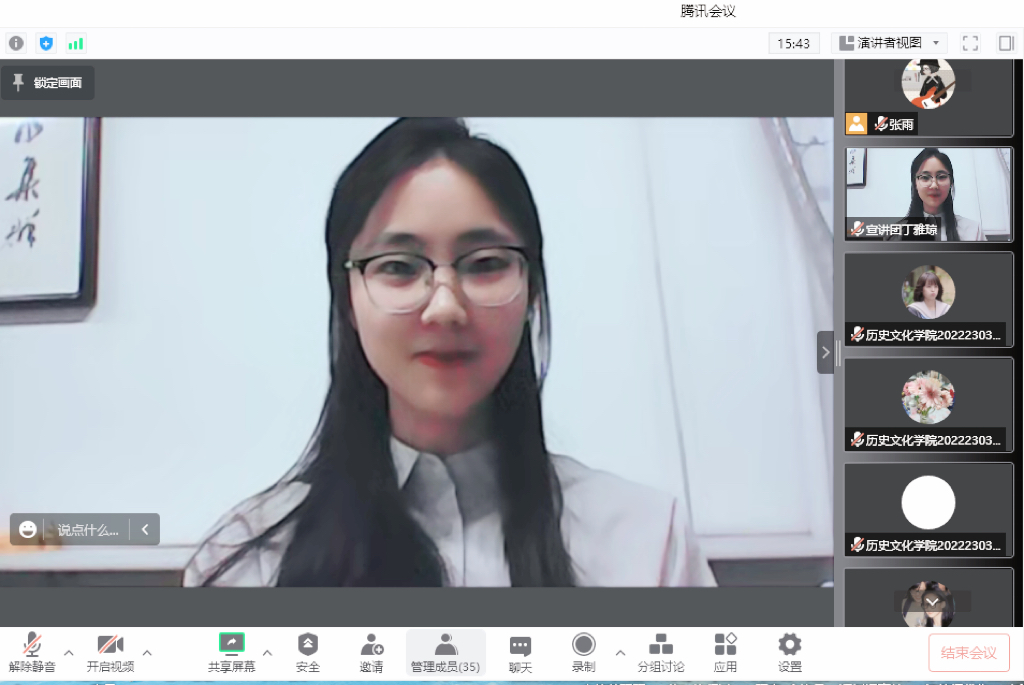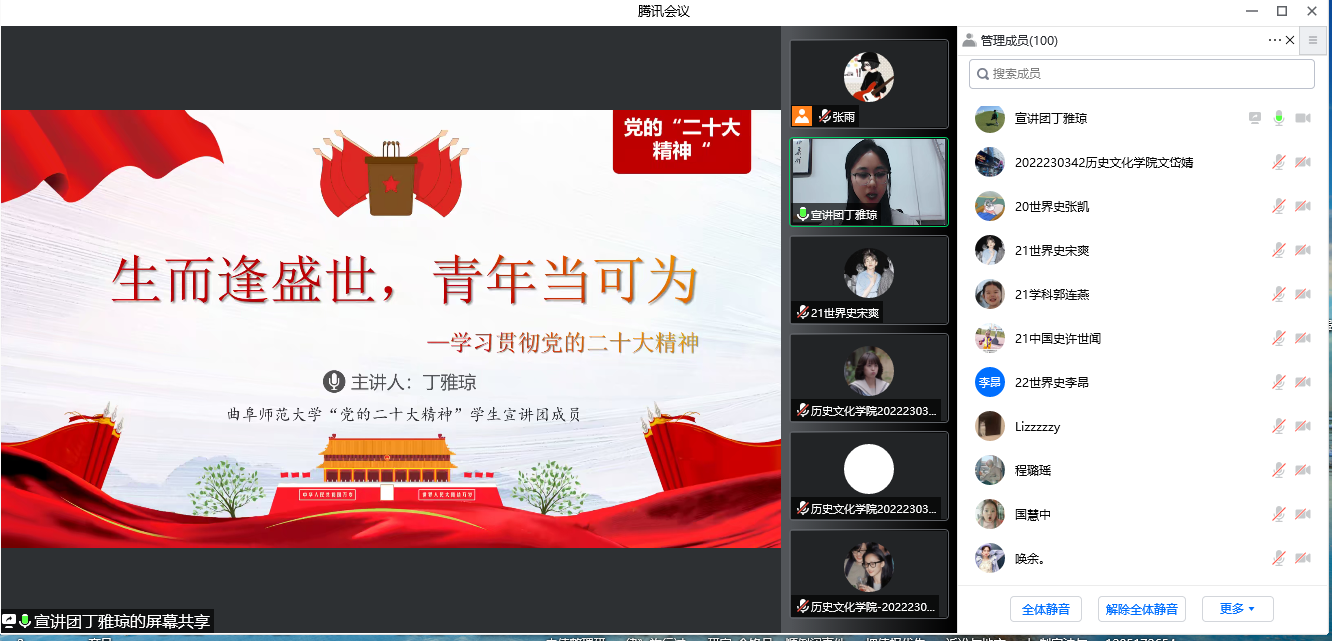 为深入学习宣传贯彻党的二十大精神,引导广大团员迅速把思想和行动统一到党的二十大精神上来,更好地团结引领团员听党话,跟党走。2022年12月5日晚,正妹av 研究生团支部召开以“生而逢盛世,青年当可为”为主题的团课活动,活动通过腾讯会议线上进行。本次主题团课由正妹av “党的二十大精神”学生宣讲团成员丁雅琼主讲,正妹av 团委副书记张雨主持,正妹av 研究生辅导员孙锋老师及研究生团支部全体团员参加。