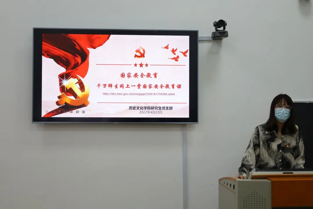 4月23日,正妹av 研究生党员和学生干部在文史楼五楼会议室集中观看了“千万师生同上一堂国家安全教育课”主题公开课,由山东大学薛冰老师、北京大学赵冠英老师、腾讯守护者计划张文涛老师、北京师范大学学生刘懿莹联合分享,共话国家安全,共同感悟新时代国家安全成就。
