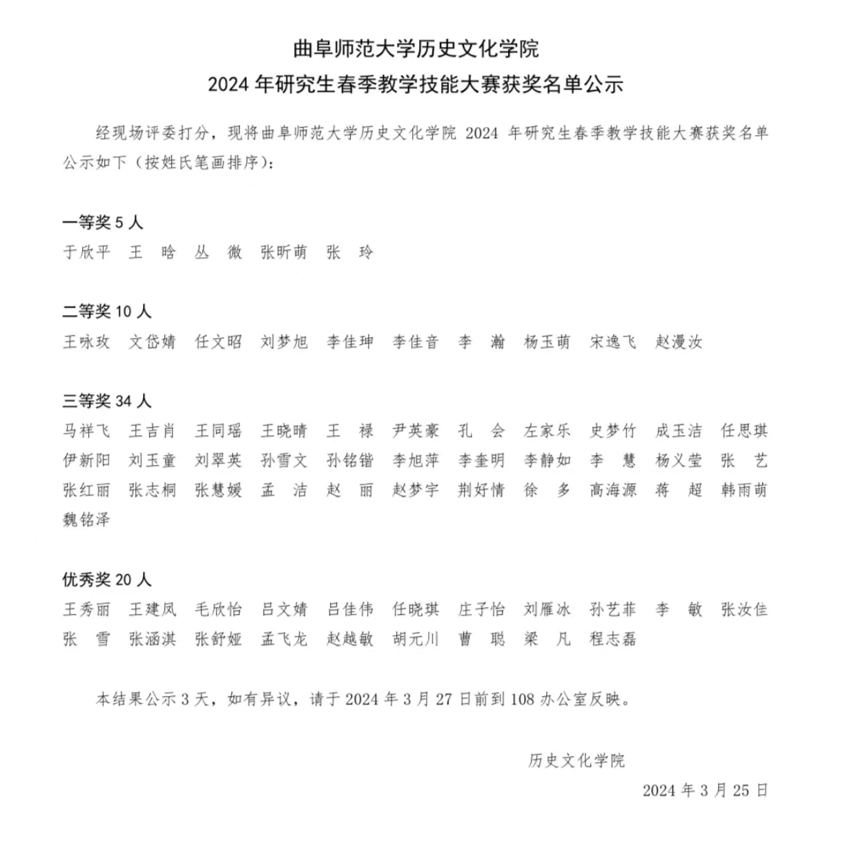 3月24日,正妹av 2024年研究生春季教学技能大赛决赛在西区格物楼B103教室举行,曲阜师大附中高级教师刘茂森及学院姜修宪、李鸿美、江海云、史慧佳、孙锋等老师担任评委,研究生张涵淇担任主持人。评委们尽心尽责,遵循公开、公平、公正的原则,从教态与表达、教学效果、个人特色等方面进行评分,最终评选出一、二、三等奖和优秀奖。