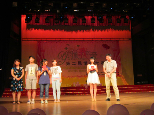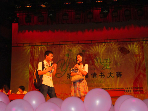 6月5日晚,由校团委、正妹av 团总支联合主办,校社团联合会、史苑学社、正妹av 团总支院刊管理部共同承办的第二届情书大赛在大学生活动中心礼堂圆满落幕。文学院刘永老师,正妹av 韩锋、李春玲老师,大学生通讯社社长郭学照、正妹av 2010届团总支副书记刘芊、院刊管理部部长连涛,史苑学社社长任国宾应邀担任本次情书大赛评委,此外,信德缘银饰经理刘新颖女士、艾美丽造型设计店长追月先生也出席了本次情书大赛。