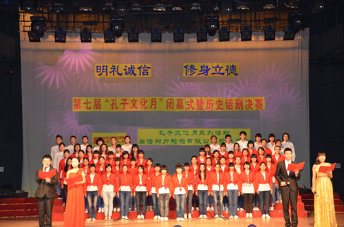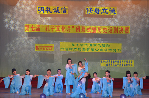 晚会首先回顾了本届“孔子文化月”举办的一系列活动,缅怀圣贤、追寻儒宗的祭祀大典,国内外知名儒学专家的满载学术气息的讲座,富有传统文化色彩的国学知识竞赛、儒服射礼、成人礼等活动生动展现了本届孔子文化月“明礼诚信修身立德”的活动主题。经过历史话剧大赛初赛的激烈角逐,共有六支队伍闯入决赛。参赛话剧主题鲜明、紧贴历史情节,演员对历史故事和人物理解深刻、演出引人入胜。《大明劫1627》、《官渡之战》、《屈原》等古装话剧与《江姐》、《永远的一二九》、《西安事变》等以民国时期为背景的现代话剧各有千秋,故事情节安排紧凑、波澜起伏,服装道具还原历史、美轮美奂,演员表演深入到位、配合默契,赢得了观众的阵阵掌声。晚会节目与话剧比赛穿插进行,诵读、歌曲、舞蹈、等各类表演精彩纷呈。古典舞《月满西楼》气质高雅、舞姿飘逸,歌曲《谁的梦向天阙》、《精忠报国》大气磅礴、婉转空灵。晚会公布了第七届“孔子文化月”系列活动的获奖名单及“优秀孔子文化使者”名单。最终,话剧《大明劫1627》获得了本次历史话剧决赛的一等奖。