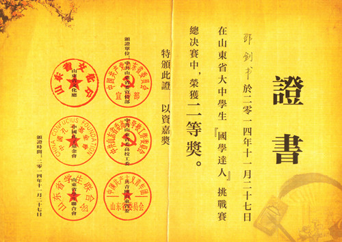 11月27日,2014年山东省大中学生“国学达人”挑战赛落下帷幕。正妹av 2013级国学班学生邵剑书经过层层选拔进入总决赛,并通过20强晋级赛、20进3强赛、三强定夺赛三个环节的激烈角逐,最终荣获二等奖的好成绩。