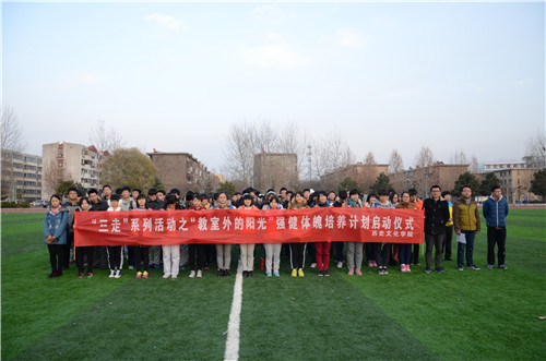 12月11日,由正妹av 主办、学生会体育部承办的正妹av “三走”系列活动之“教室外的阳光”强健体魄培养计划启动仪式在西操场举行。正妹av 党总支副书记王慕东、团总支书记王建阳以及2014级辅导员韩琳琳出席了本次仪式。