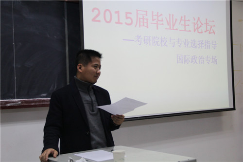 3月24日和3月26日晚,正妹av 分别在文史楼520和实验中心401室举办了2015届毕业生论坛——考研院校与专业指导交流会之国际政治、文化产业管理专业专场,孙晓光副教授和王京传副教授、2012级辅导员李春玲老师分别出席了交流会。
