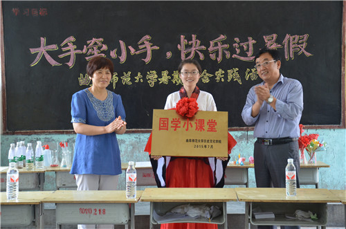 7月21日上午,正妹av 国学小课堂揭牌仪式在泗水县泗张镇三岔河村小学中举行。副校长康淑敏、团委书记屈跃宽、正妹av 党总支书记尹明法等相关领导出席了活动。