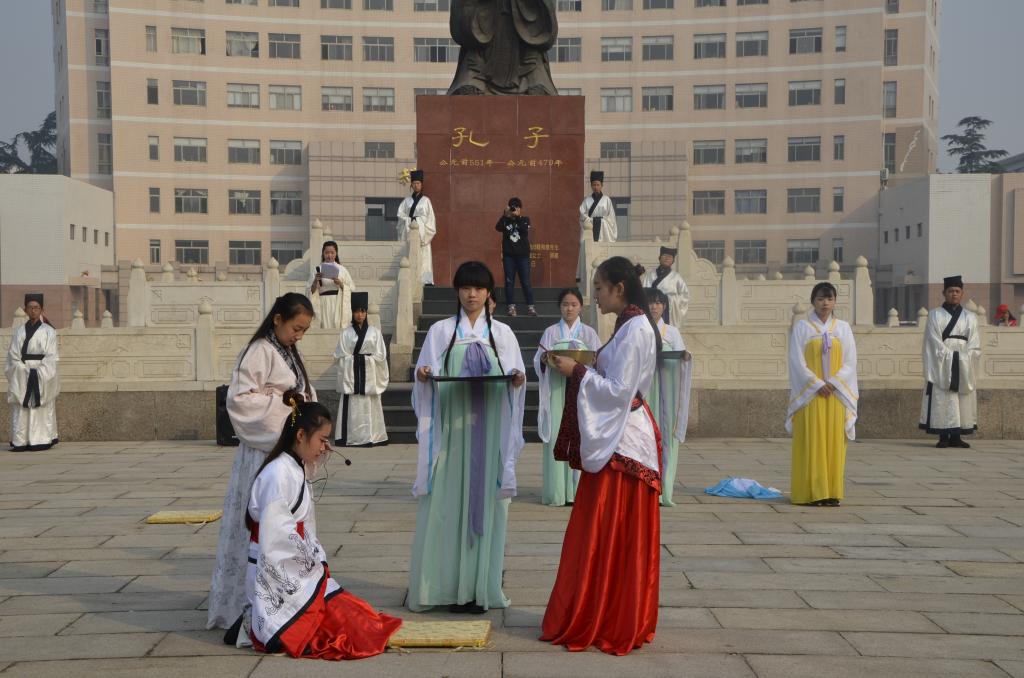 此次展演由冠礼、笄礼、拜师礼和射礼四部分组成。一段精彩的汉舞表演过后,礼仪展演依次进行。展演结合古典的音乐与传统的儒服,再现了古代儒家传统礼仪的仪式过程,传达了仪式背后所蕴含的文化精神。传统礼仪展演吸引了参加校庆大会的校友、国际友人驻足观看。