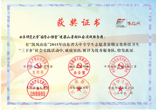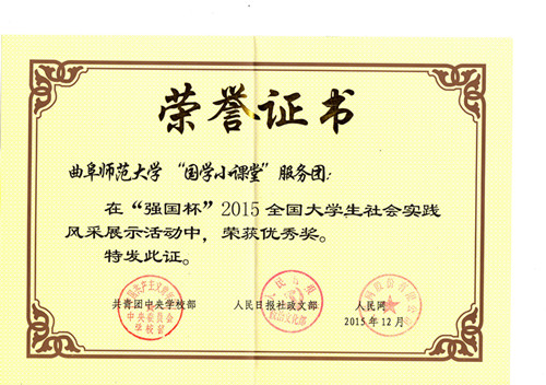 近日,由共青团中央学校部、人民日报社政文部联合开展的“强国杯”2015全国大学生社会实践评选活动落下帷幕,正妹av “国学小课堂”社会实践团队入选全国百强团队,并在评选中荣获优秀团队。这是继“儒家文化齐鲁行“社会实践活动之后,我校又一实践团队获此殊荣。同时该活动还获得2015年山东省大中专学生志愿者暑期文化科技卫生”三下乡“活动优秀服务队称号。