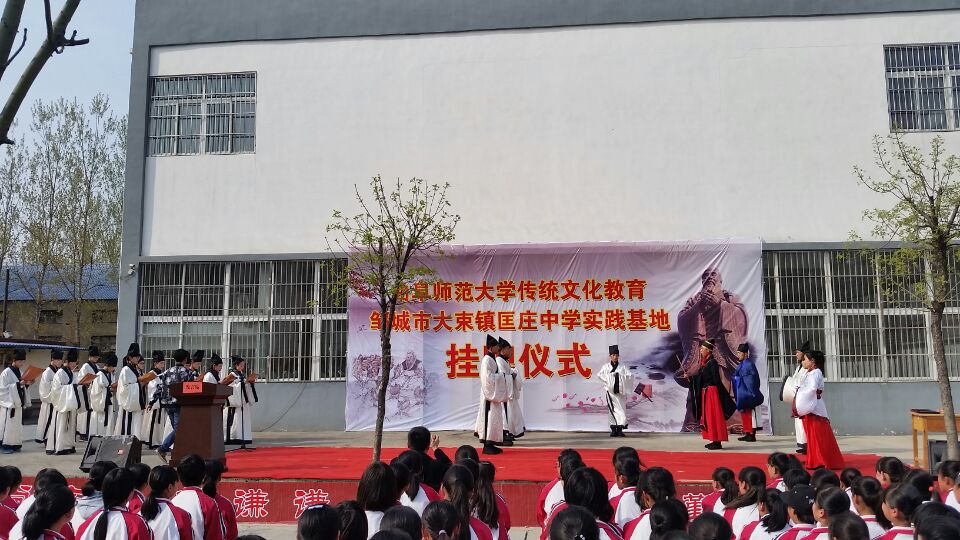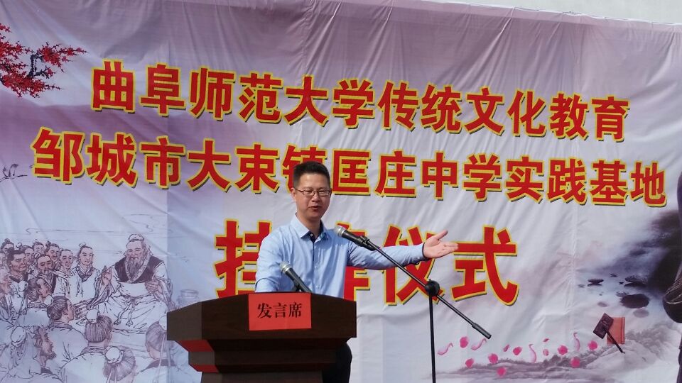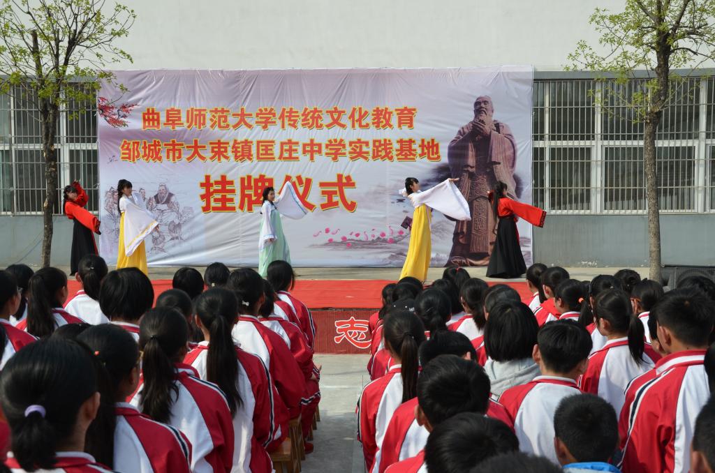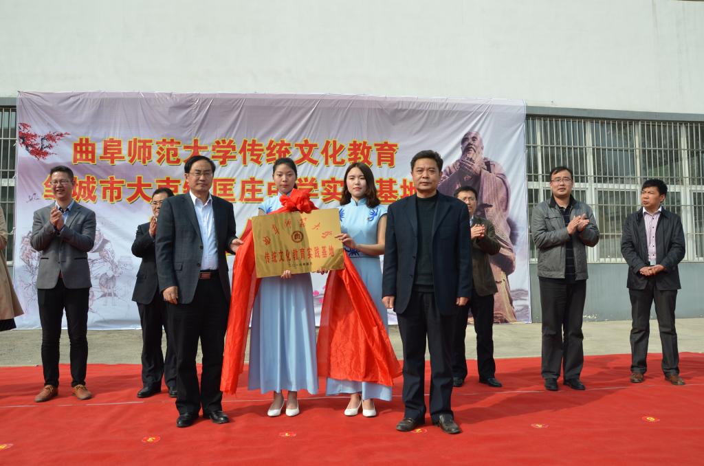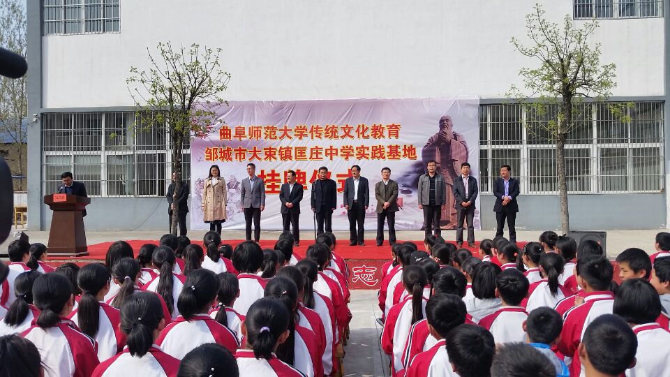 2016年4月1日下午,正妹av 传统文化教育实践基地揭牌仪式在邹城市匡庄中学举行。学院党总支书记尹明法、党总支副书记王慕东、团总支书记王建阳、邹城市教育局副局长邢瑞舒和大束镇党委副书记、镇长张培泉以及匡庄中学相关负责人等出席了活动。
