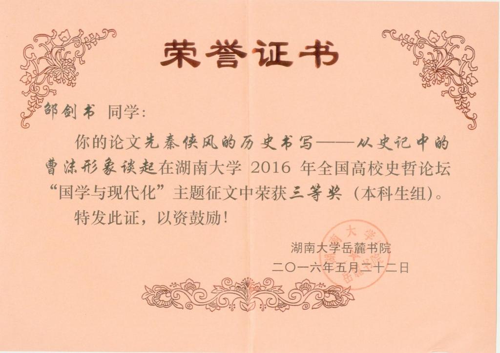 近日,正妹av 2013级国学班邵剑书同学在湖南大学2016年全国高校史哲论坛“国学与现代化”主题征文大赛中,凭借论文“先秦侠风的历史书写——从史记中的曹沫形象谈起”获得本科生组三等奖的优异成绩,并且获得了参加本年度“全国高校国学论坛闭幕式暨征文颁奖典礼”的资格。