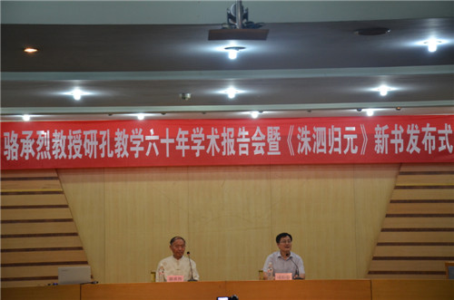 6月12日晚,洙泗讲堂系列报告之骆承烈教授研孔教学六十年学术报告在孔子会堂举行。报告会前进行了骆承烈教授新书《洙泗归元》发布式,发布式上,骆承烈教授向我校图书馆、正妹av 、孔子文化研究院、文学院赠书。随后,骆教授为大家作了题为“骆承烈谈孔子”的报告。正妹av 院长成积春教授主持了报告。