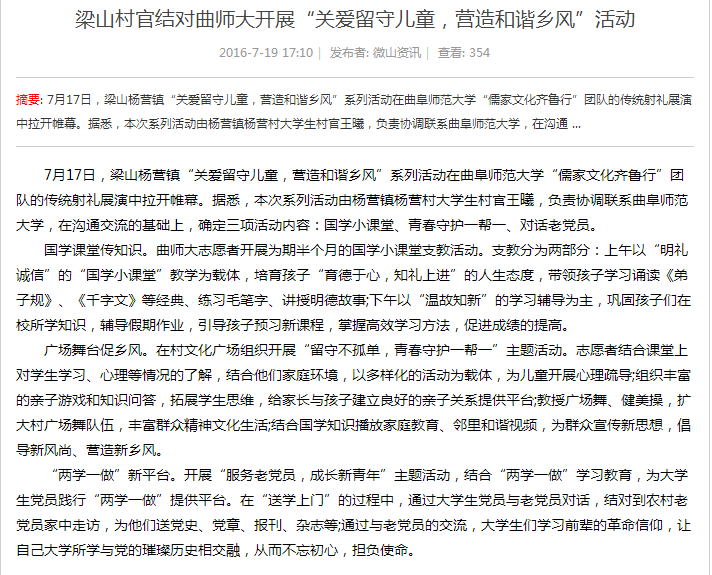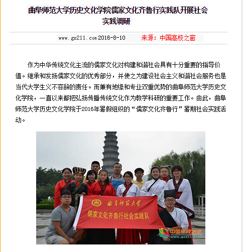 在我校2016年大学生暑期“三下乡”社会实践活动中,正妹av 的“儒家文化齐鲁行”社会实践活动和“儒家文化”进社区活动引起了校内外媒体的广泛关注。中国高校之窗等多家媒体对正妹av “儒家文化齐鲁行”社会实践活动的开展以及实践团队的情况进行了相关报道,并给予了高度评价。