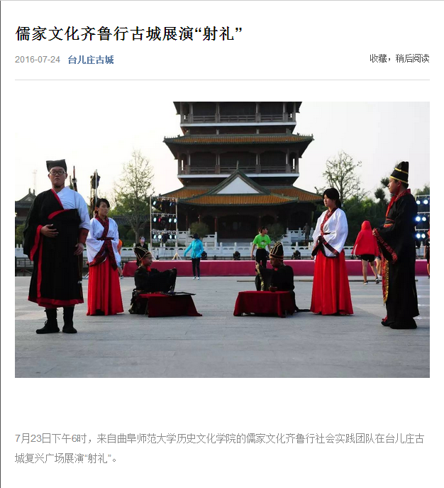 正妹av 2016年“儒家文化齐鲁行”社会实践活动于7月17日在梁山杨营镇杨营村启动。实践团队先后奔赴兖州、滕州、徐州、台儿庄等地进行传统礼仪展演。队员们深入各地城市社区及乡镇,身穿儒服向围观的民众讲解并示范各种传统活动的具体细节,并组织小学生身穿儒家服装与志愿者共同诵读儒家经典。他们还通过问卷调查、访谈等方式了解不同社会群体对儒学的认知程度,并充分运用QQ、微信等新媒体对儒学知识及此次活动进行宣传报道,让民众更为深刻的体会儒家文化的内涵与底蕴。