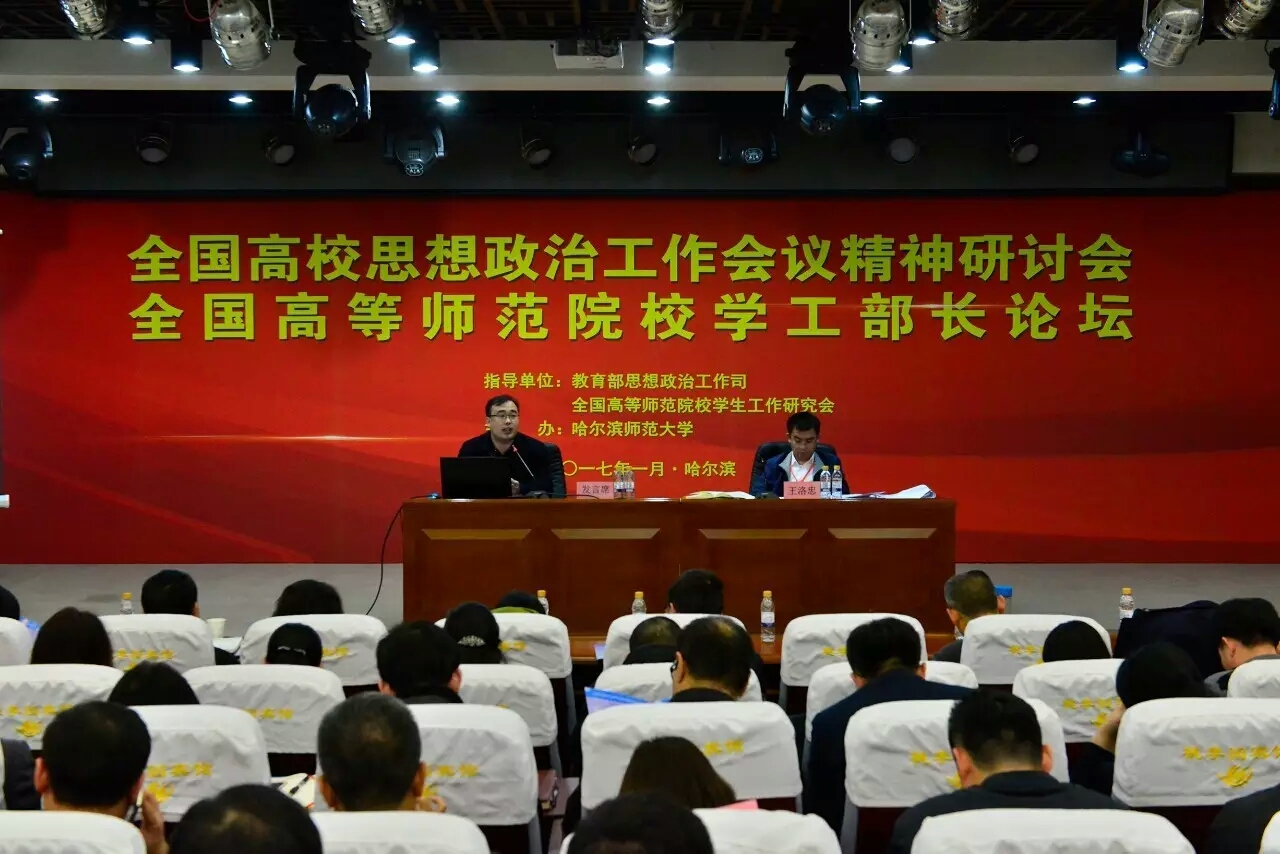 本次会议是在教育部思政司指导下,由全国高师院校学生工作研究会主办,哈尔滨师范大学承办。主题是为深入贯彻落实全国高校思想政治工作会议精神,进一步贯彻中央关于立德树人、加强高校思想政治工作的有关指示和决策部署,交流高师院校思想政治教育工作经验,推动全国高师院校大学生思想政治工作创新发展。共有来自全国43所高等师范院校的65位学生工作负责人参加了会议。