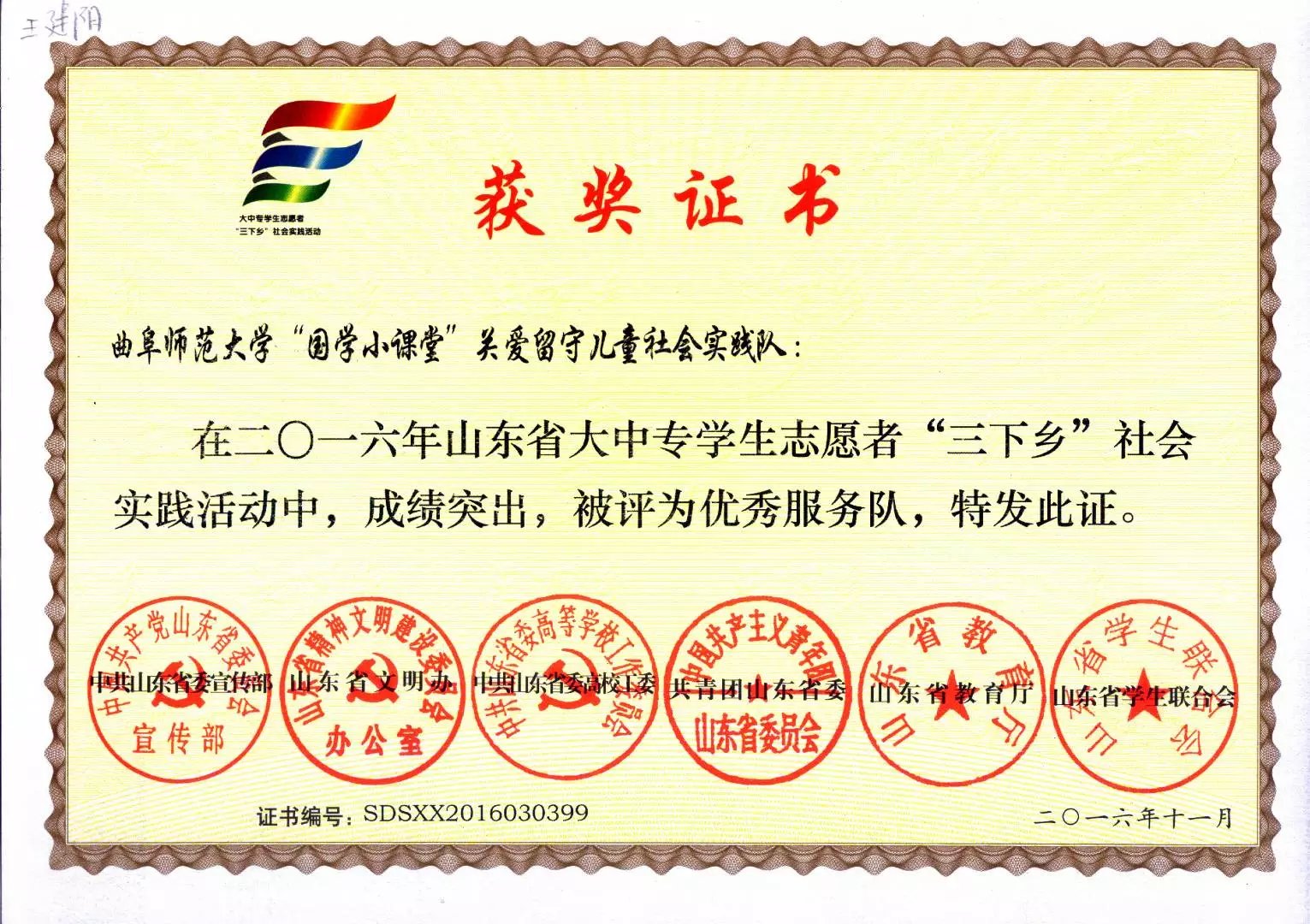 近日,2016年山东省大中专学生志愿者暑期三下乡社会实践活动落下帷幕。正妹av “国学小课堂”和“儒家文化齐鲁行”社会实践队双获优秀服务队和省级优秀实践团队,张俊成获优秀指导教师,刘雁成、朱晓明两位同学获优秀队员。