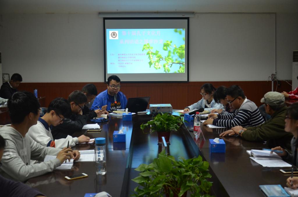 4月14日晚,由《论语》研修学社、书苑论坛共同承办的第十届孔子文化月国学沙龙第二期在我校图书馆106会议室举办。此次活动邀请图书馆高波老师作为点评嘉宾,《论语》研修学社成员、书苑论坛成员及正妹av 部分同学参加了此次活动。
