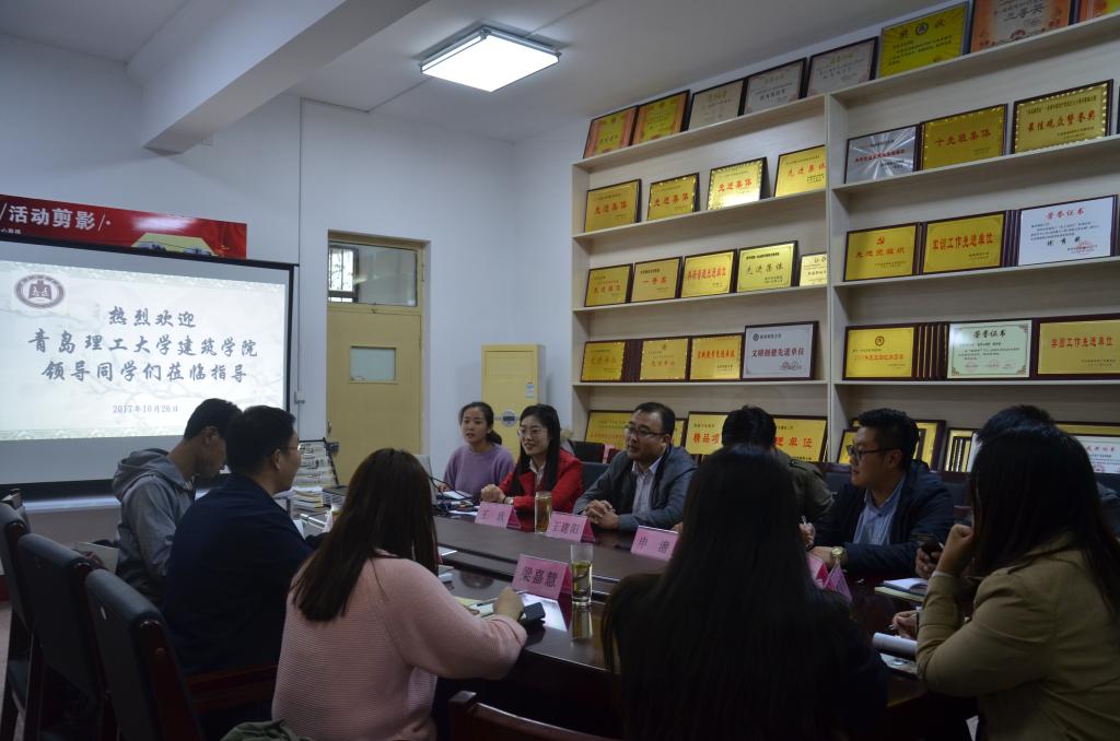 10月26日下午,青岛理工大学建筑学院团总支书记高江、团总支副书记姜松以及学生会主席梁嘉慧来正妹av 进行工作交流。正妹av 团委书记王建阳、团委副书记王玖、学生会主席付盛阳等主席团成员出席交流会。