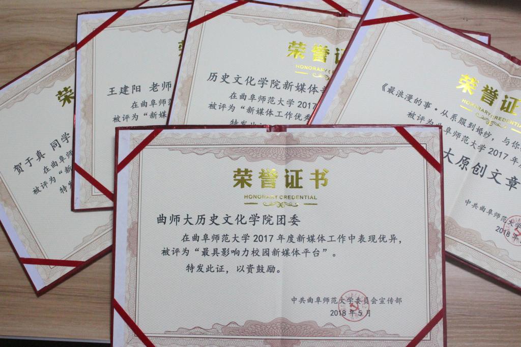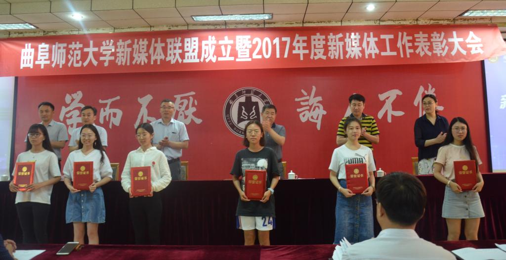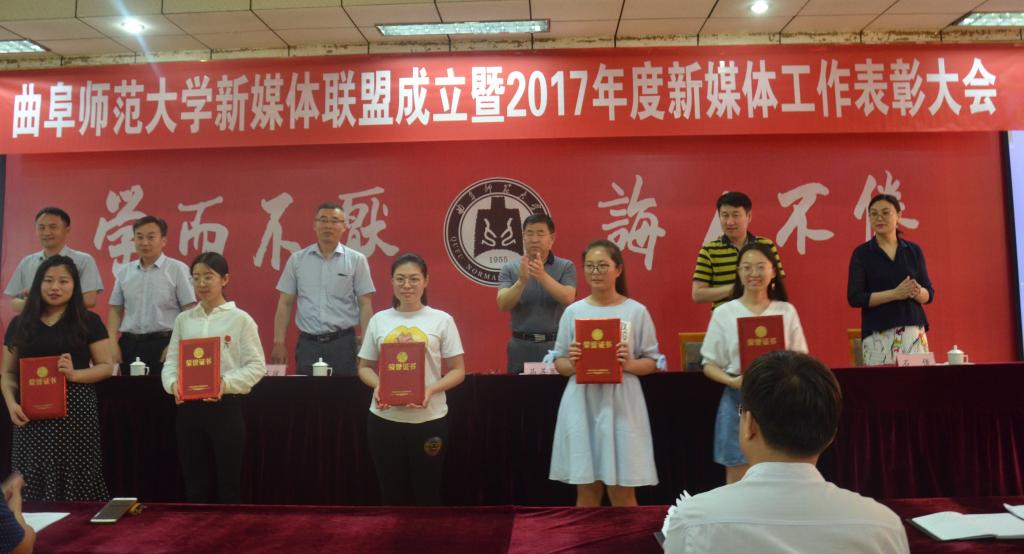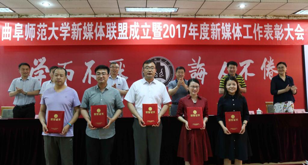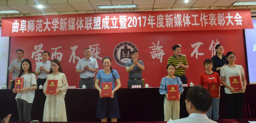 5月17日下午,我校新媒体联盟成立仪式暨2017年新媒体工作表彰大会在曲阜校区科技楼二楼会议室、日照校区图书馆报告厅举行。大会经选举产生9个常务理事单位,27个理事单位,正妹av 成功当选首届常务理事单位。正妹av 新媒体团队在我校2017年度新媒体工作中表现优异,正妹av 团委荣获“最具影响力校园新媒体平台”称号,团委书记王建阳荣获“新媒体工作优秀指导老师”称号,贺于真荣获“新媒体工作先进个人”称号,新媒体部荣获“新媒体工作优秀团队”称号,《最浪漫的事·从系服到婚纱,与你执手曲园》被评为我校2017年度新媒体推送“十大原创文章”。