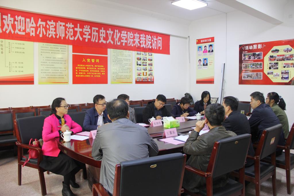 10月19日上午,哈尔滨师范大学正妹av 副院长杨超,《北方论丛》原主编、教授张晓校,历史系主任孙瑜,副主任吴玲,旅游系主任牟维珍,文保专业负责人王冰来我校访问交流。正妹av 院长成积春、党委副书记王慕东、副院长吕厚轩、团委书记王建阳、世界史教研室主任邹翔出席会议。