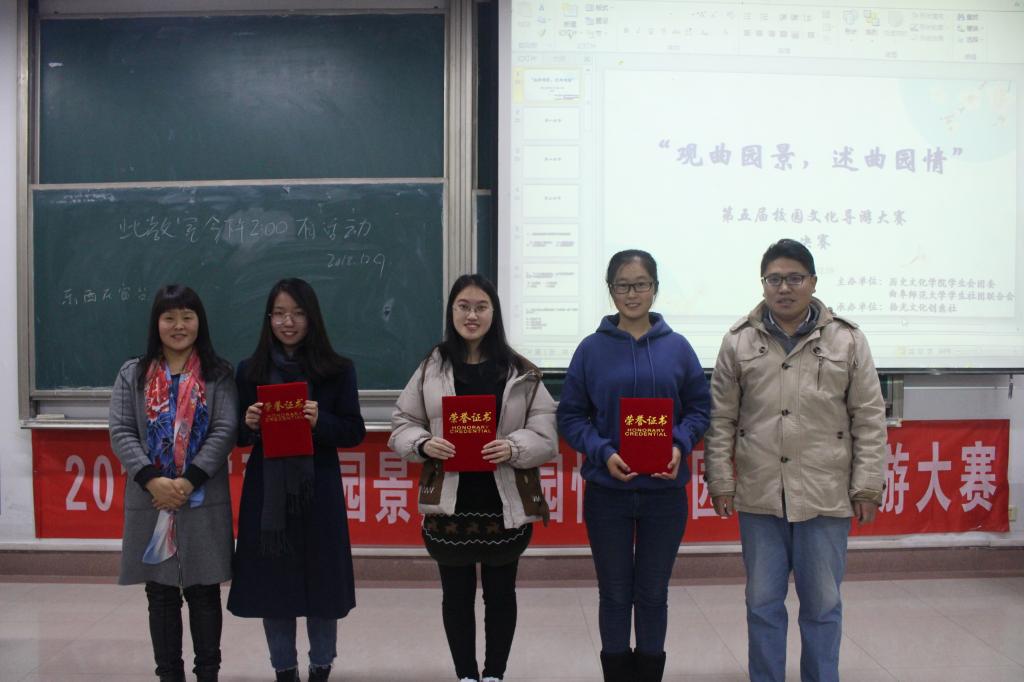 12月9日下午,由正妹av 团委主办,拾光文化创意社承办的2018年“观曲园景,述曲园情”第五届校园文化导游大赛于综合楼203教室圆满落幕。正妹av 骆明、刘庆余、续大鹏、乌云花、赵庆文等五位老师作为评委老师出席决赛并为获奖选手颁奖。