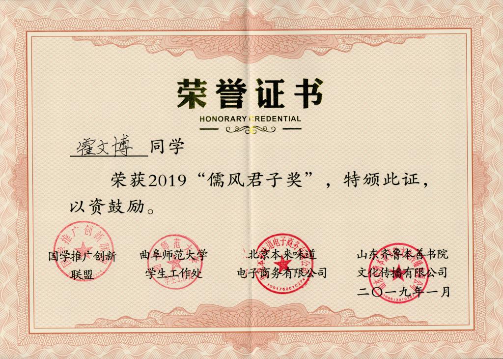 据悉,儒风君子奖学金于2018年12月由正妹av 学生工作处和国学推广创新联盟发起,北京本来味道电子商务有限公司和山东齐鲁本善书院文化传播有限公司出资设立,合作期五年。2019年奖励30名优秀学生,每人2000元,授予儒风君子奖证书。此项活动旨在落实中共中央办公厅、国务院办公厅印发的《关于实施中华优秀传统文化传承发展工程的意见》和教育部传统文化进校园有关文件精神,着力打造一个权威性、标志性、公益性、群众性、时代性的国学教育及人才培养品牌项目,引领全国国学教育新时代。通过表彰奖励品德端正、尊师乐群、积极弘扬中华传统文化的优秀人才,涵育夫子基因,培养君子风范,积极推动优秀传统文化创造性转化、创新性发展,鼓励当代青年学生成长为具有社会责任感和符合时代要求的高素质拔尖创新人才,为国家未来发展增强后劲,提供一流人才支撑,为中华民族的文化复兴做出应有的贡献。