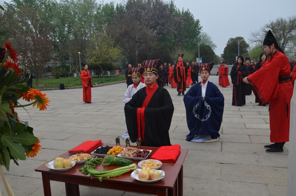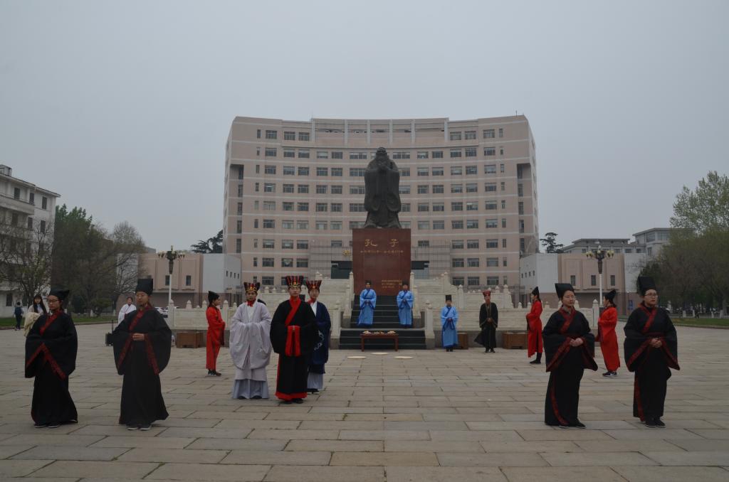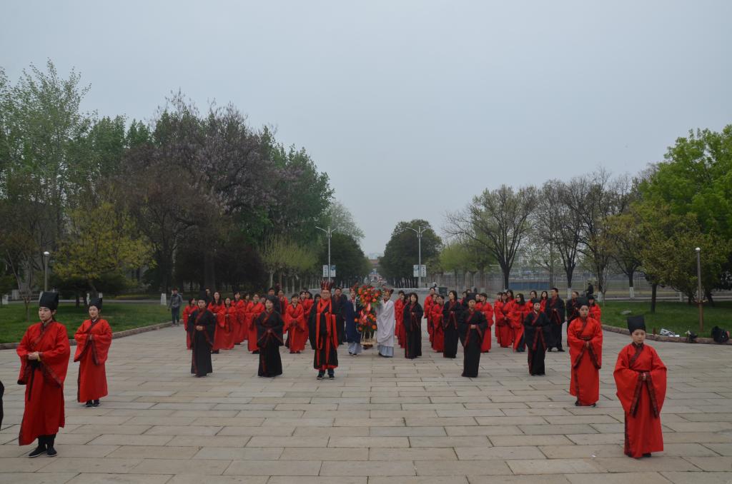 4月12日下午,正妹av 传统礼仪研修中心在孔子文化广场为江苏省优秀教师干部举行了“迎宾礼”和“祭至圣先师礼”展演。