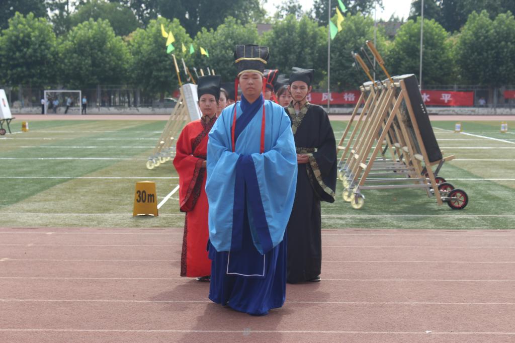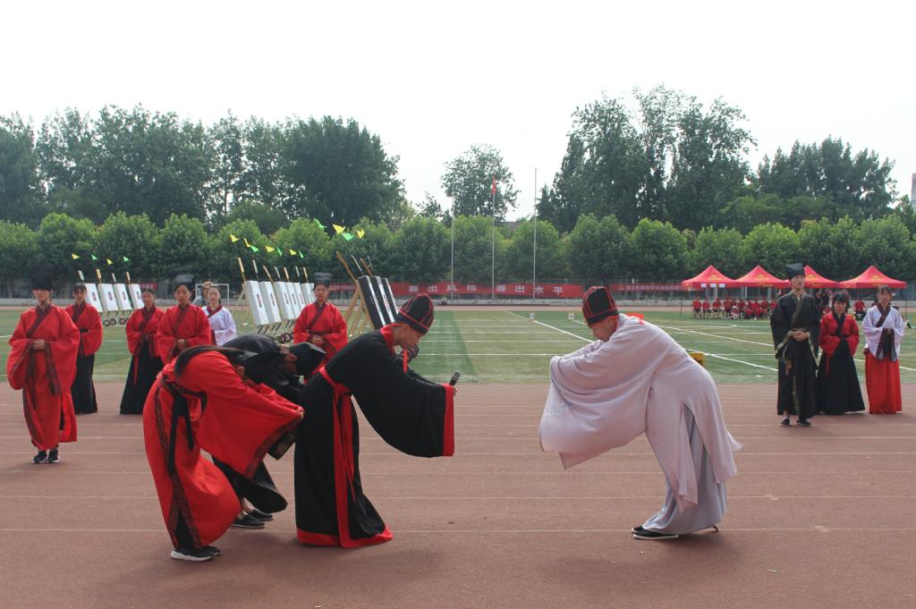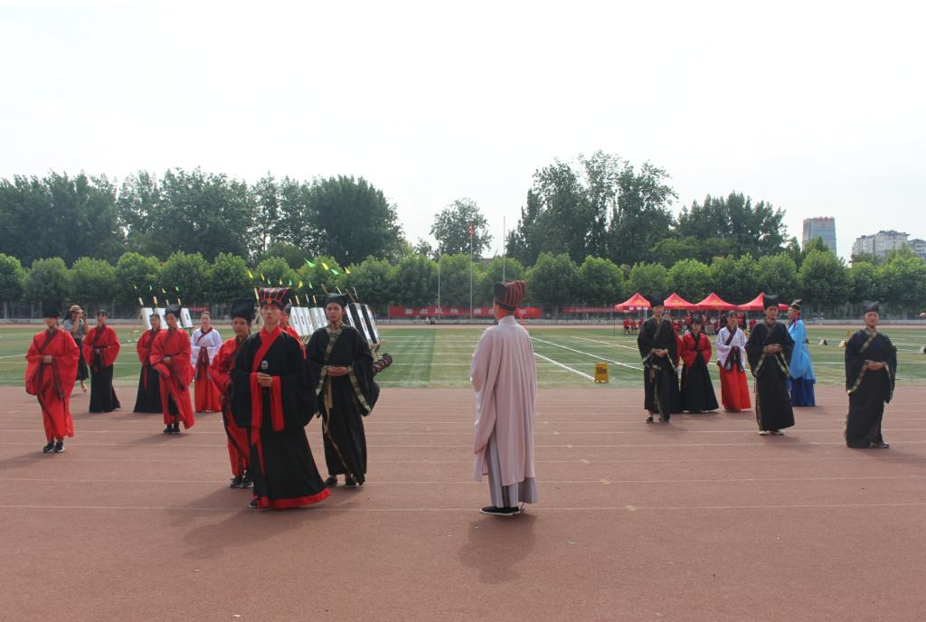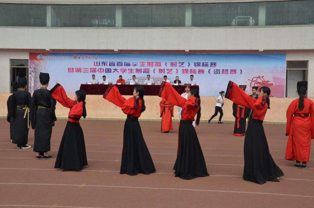 6月22日上午,正妹av 传统礼仪队在南操场为第三届中国大学生射箭(射艺)资格赛暨山东省首届学生射箭(射艺)邀请赛举行迎宾礼开场展演。
