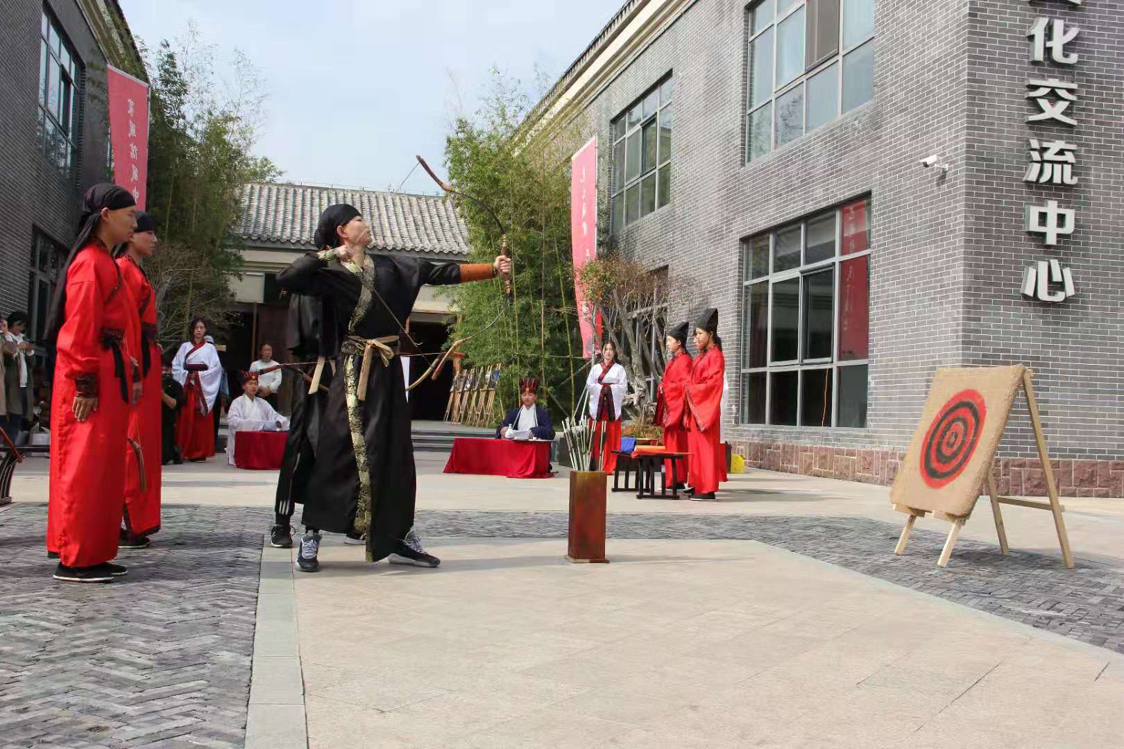 随着弦和之乐缓缓奏起,学生代表身穿汉服、头顶儒冠向来往游客进行射礼和束脩礼展演。两场仪式庄严、古朴,赢得在场观众的一致好评,弘扬了儒家传统文化,体现出对老师、对知识的推崇,展现出深厚的文化底蕴。