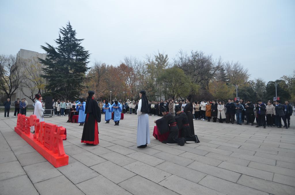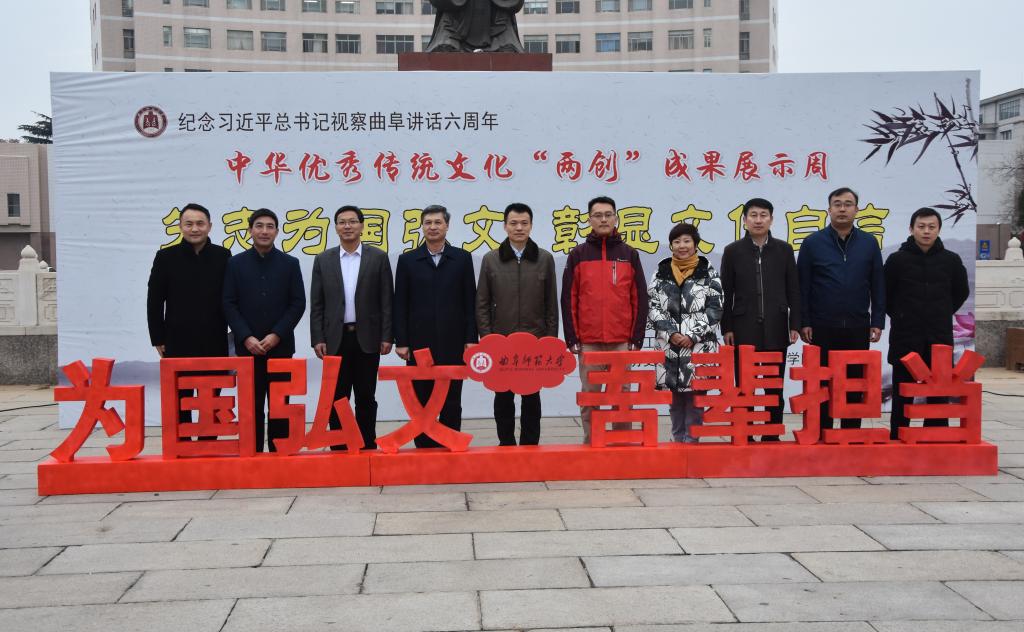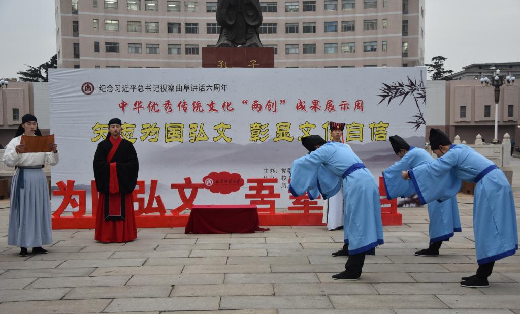 11月26日下午,为纪念习近平总书记视察曲阜6周年重要讲话,推动落实”文化立校”战略,推进中华优秀传统文化继承与发扬,由校党委宣传部、校团委、校工会、离退休工作处、体育科学学院、书法学院和正妹av 联合举办的中华优秀传统文化“两创”成果展示周活动开幕式在孔子文化广场隆重举行。学院党委副书记王建阳出席仪式。