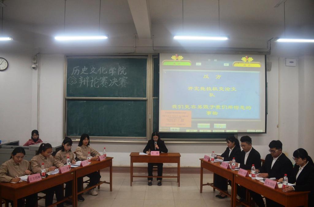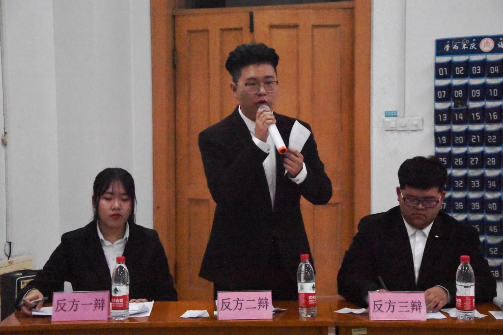 经过初赛、复赛、四分之一决赛和半决赛的激烈角逐,由尹英豪、宗胜楠、周天宁、郑菊组成的“就服我队”和由朱启祯、金泓旭、李艾嘉、胡静宜组成的“开完拖拉机交论文队”挺进决赛。辩手围绕“我们更容易毁于我们所热爱/憎恶的事物”展开激烈辩论。首先,正反双方分别进行了开场立论和盘问,对自己的观点进行了细致阐述,并对对方辩手的论述进行盘问。然后进入自由辩论环节,双方辩手更是逻辑清晰、语言流利得论述了自己的观点。总结陈词环节,正反双方的四辩总结了自己队伍的论述,更加清晰的展示了自己队伍的观点。