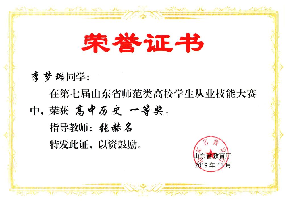 11月8日至9日,第七届山东省师范类高校学生从业技能大赛决赛在鲁东大学举行。副院长王京传和指导教师刘伟、李建、张赫名带队参赛,两名推荐选手和两名抽取选手分别参加了初中历史和高中历史组比赛。正妹av 张赫名老师荣获“优秀辅导教师”称号,学生李梦璐荣获高中历史组一等奖,时雯、张雅菱荣获高中历史二等奖,谢景雯荣获初中历史组二等奖,李梦璐、时雯荣获钢笔字技能考核A等奖,张雅菱、谢景雯荣获钢笔字技能考核B等奖。