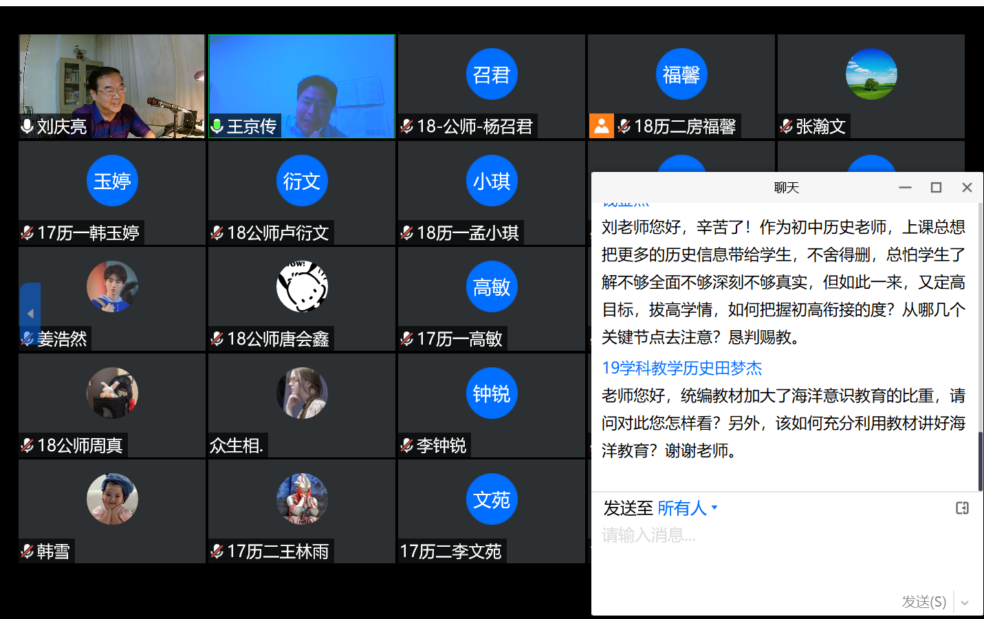 6月12日晚,2020年第1期洙泗讲堂暨“中学历史教学名师进曲园”讲座通过腾讯会议在线上举行。刘庆亮教授为正妹av 师生做了题为“怎样做一个优秀的中学历史教师”的报告。报告由正妹av 王京传教授主持。