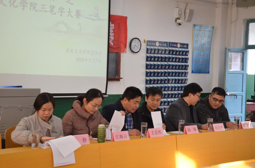 为树立学生汉字书写规范意识,提高学生的教育教学综合素养,11月7日上午,正妹av 于文史楼411教室举办“杏坛杯”三笔字大赛。正妹av 王京传、孙锋、江海云、巩宝平、续大鹏、王静六位老师出席比赛并担任评委。